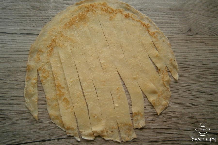 15. Красный блинчик порезать на такой же ширины отдельные полосы. Завернув полосы, через одну вверх белого блина, горизонтально разместить полоску красного блина.