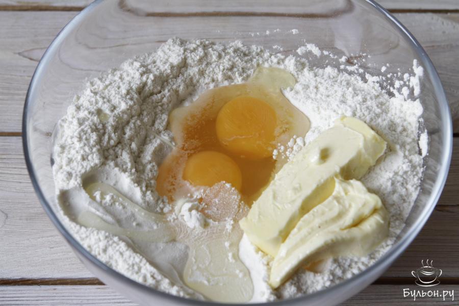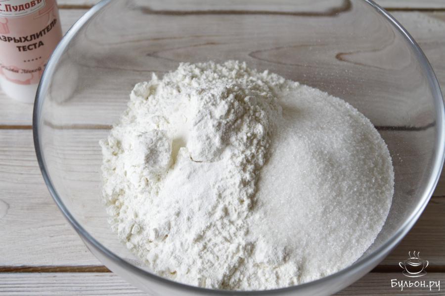 1. Все ингредиенты должны быть комнатной температуры. В чашу просеять муку, добавить разрыхлитель и сахар.