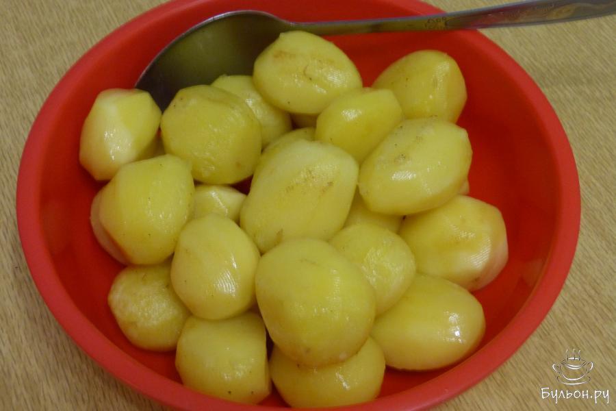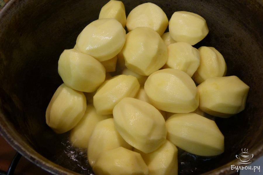 2. Картофель помыть, почистить и посолить. В большой казан налить растительное масло и накалить его. Как появятся пузырьки, положить картофель и обжарить его на сильном огне 5 минут.