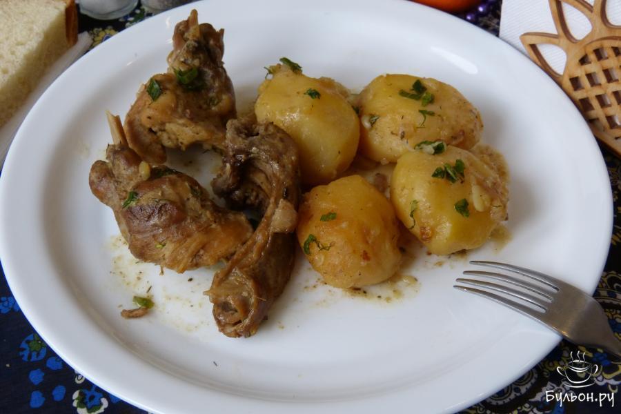 9. Можно подать порционно. Соус не нужен, чтобы не перебить вкус приготовленного блюда. А вот свежие овощи и зелень здесь будут кстати. Кушайте на здоровье и угощайте своих близких вкусным и аппетитным "Казан-Кабобом" из кролика с картошкой по-узбекски, приготовленным в казане.