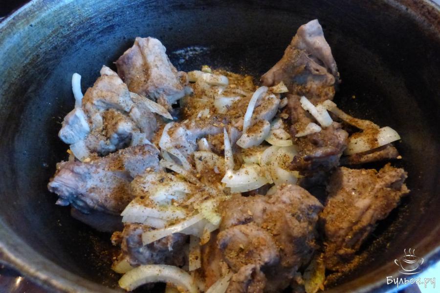7. Затем снять крышку, перемешать, посмотреть не пригорает ли мясо. Если жидкость выпарилась и мясо начало приставать к казану, добавьте полстакана горячей кипяченой воды. Закройте крышку и тушите еще 30 минут.
