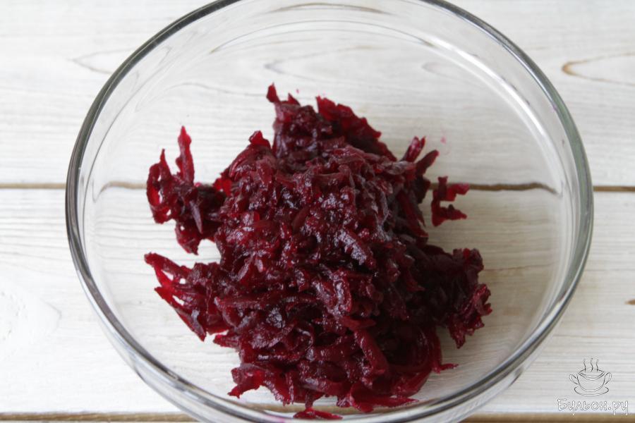 1. Подготовить свеклу. Отварить ее до готовности или же запечь в духовке предварительно завернув ее в фольгу. Свеклу остудить, почистить и натереть на терке среднего размера.