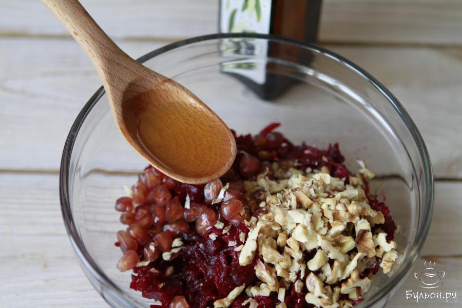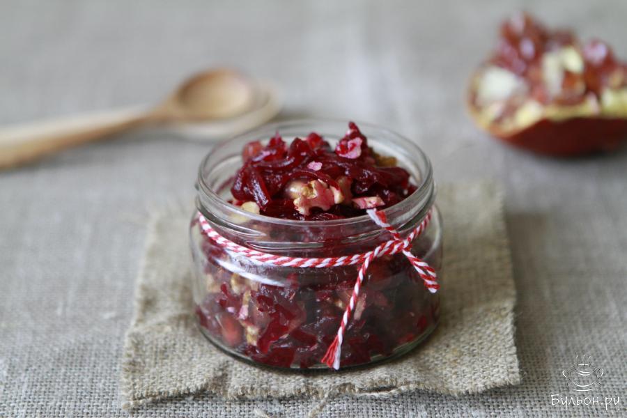 Начался Великой Пост. Верующие люди воздерживаются от тяжелой и животной пищи. Сегодня с большим удовольствием хочу поделиться с вами рецептом свекольного салата. Любители свеклы по достоинству оценят легкий, витаминный салат с добавлением грецких орехов и граната. Признаться честно этот салат самый настоящий кладезь витаминов. Подать его можно в двух вариациях, как салат к основному блюду или как десерт. Если планируете подать салат в качестве десерта, то тогда рекомендую граната добавить чуть больше, нежели указано в рецепте. А в качестве украшения использовать листья мяты или базилика.
