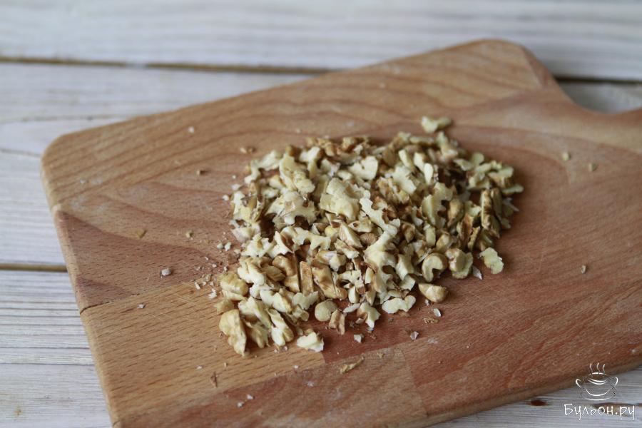 2. Грецкий орех порубить ножом, но не превращать его в мелкую крошку. Изюминка салата заключается в том, чтобы орех чувствовался.