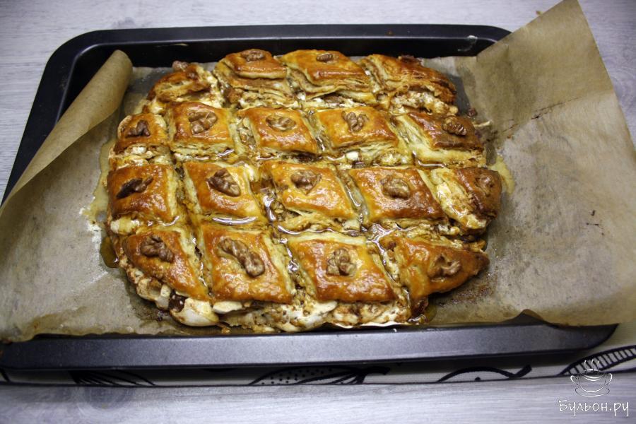 9. Сверху аккуратно положить выпеченный корж и нанести оставшуюся начинку. Затем еще один пласт теста. Смазать поверхность сырым яйцом. Пахлаву в сыром виде аккуратно разрезать на ромбики. Украсить кусочками гречкого ореха.