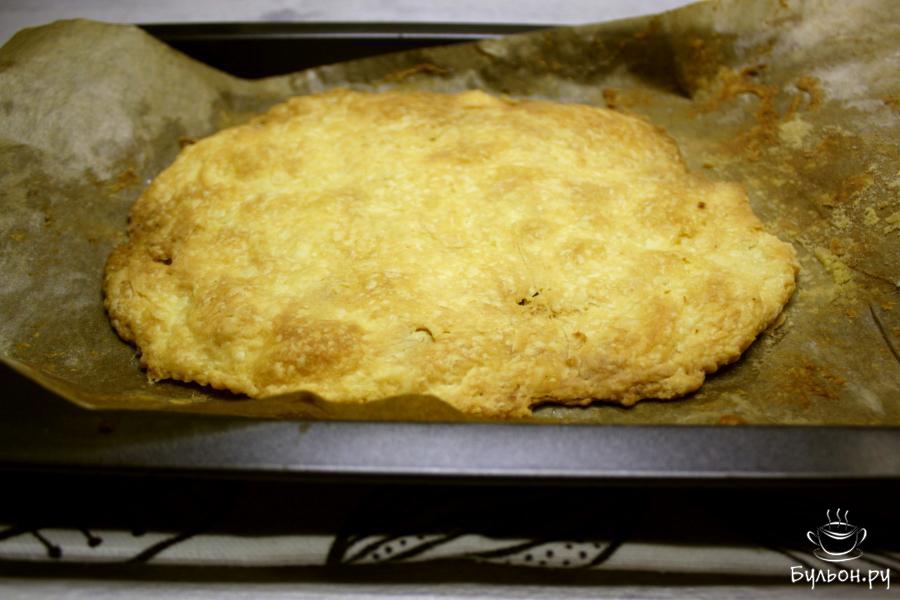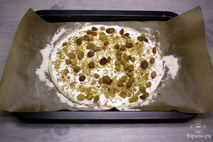 8. Раскатать еще 2 одинаковых коржа. На низ противня уложить один пласт теста, смазать половиной безе, посыпать половиной орехов и изюма, обсушенного салфетками.