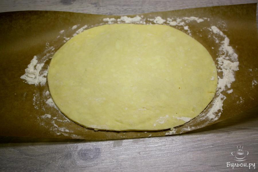 6. Разделить тесто на три равные части. Одну часть раскатать в пласт толщиной 3-4 мм. Неиспользуемое тесто нужно держать в холодильнике.
