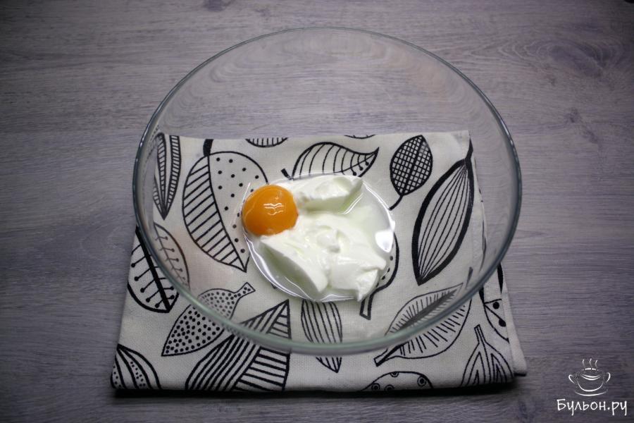 3. Всыпать крошку к сметанно-яичной смеси. Лопаткой все смешать. Накрыть пищевой пленкой и убрать в холодильник.