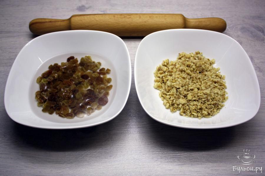 4. Для начинки грецкие орехи измельчить в крошку с помощью скалки или блендера. Изюм замочить в теплой воде.