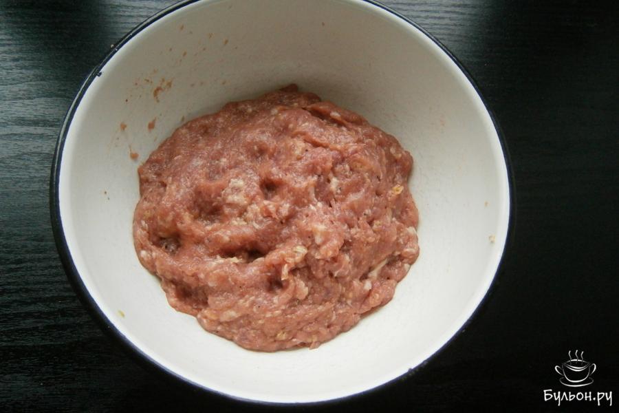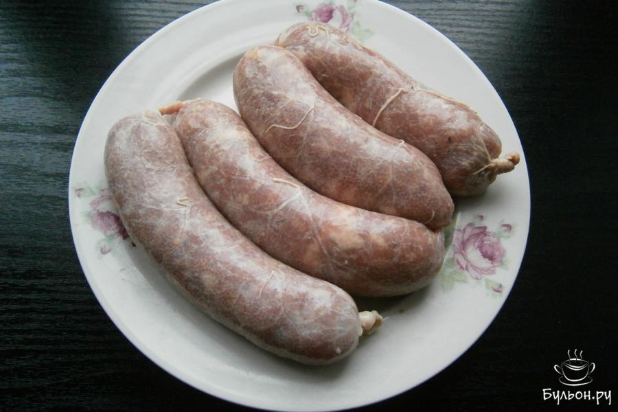 9. Наполнить кишки подготовленным острым свиным фаршем удобным для вас способом не слишком плотно, перекручивая кишку через 15 см. Должно получиться 4 колбаски. Концы кишок перевязать, сами колбаски поколоть иголкой.