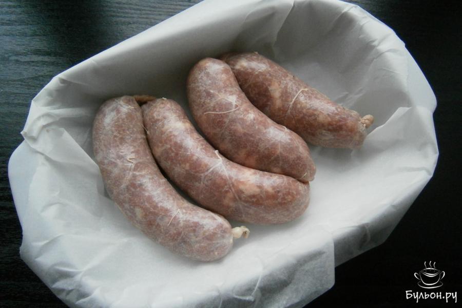 10. Любую, удобную форму для запекания застелить пергаментом, выложить в нее колбаски, сбрызнуть их растительным маслом.
