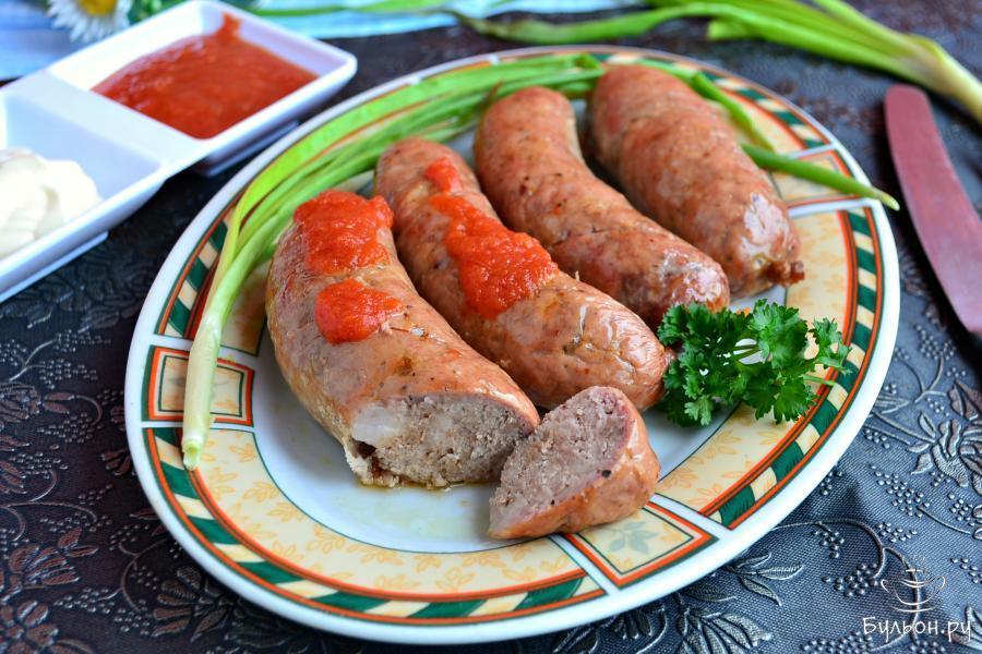 12. Остренькие свиные колбаски можно подать сразу, а можно еще поджарить на сковороде или гриле. Подать колбаски в горячем виде. Приятного аппетита.
