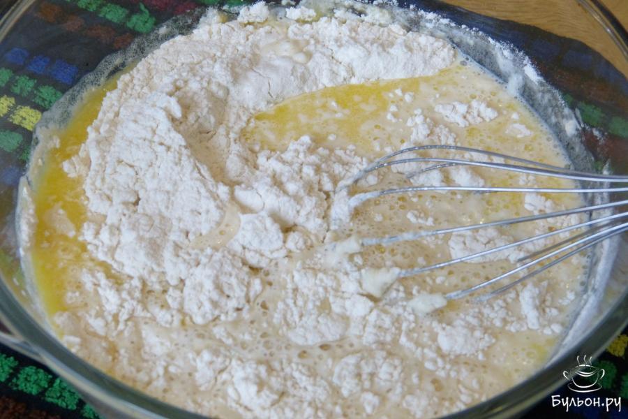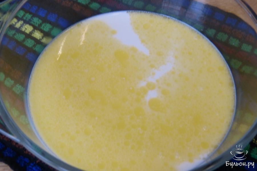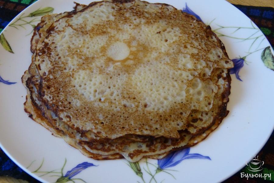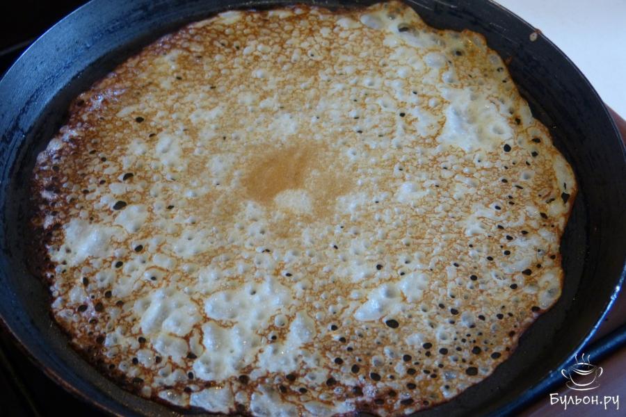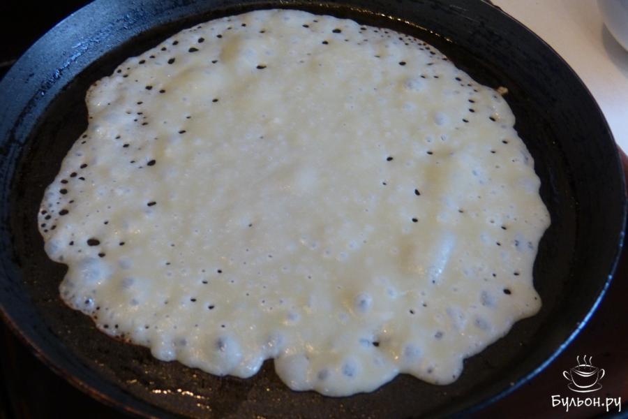 4. Обмакнув кисточку в растительное масло, смазать раскаленную сковородку. Налить небольшое количество теста, выпекать до золотистой корочки.