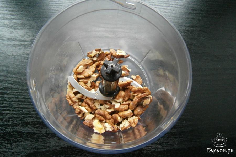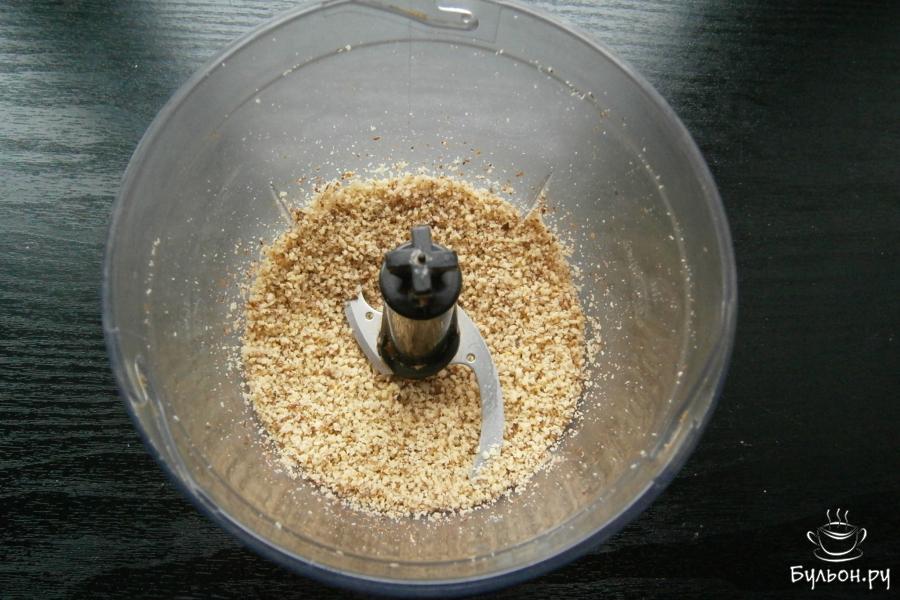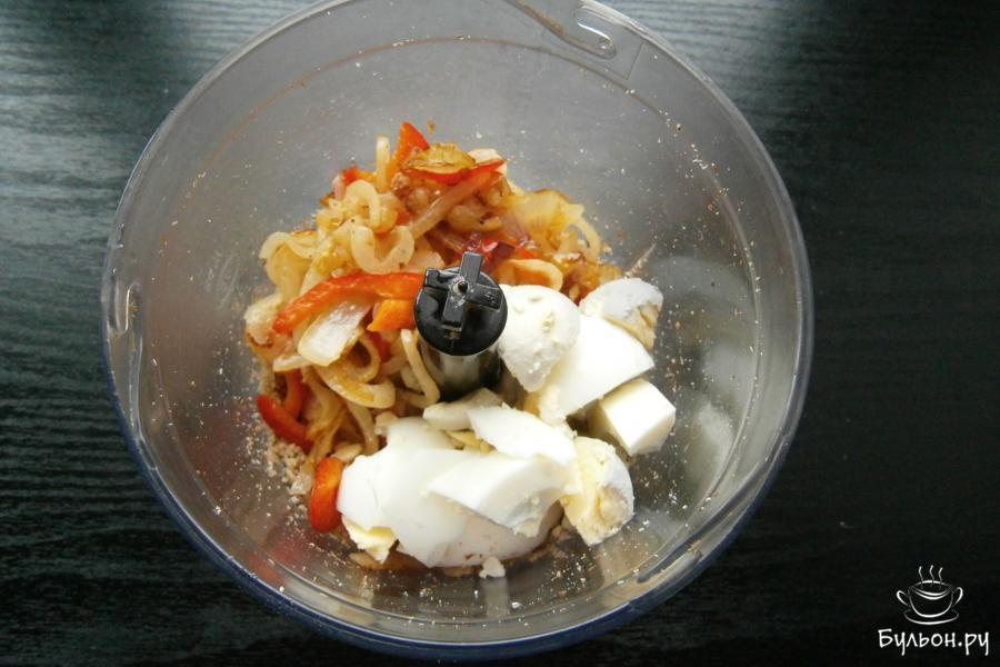 5. Лук немного остудить и добавить его в чашу блендера к измельченным орехам. Также, сюда добавить и предварительно сваренные вкрутую яйца.
