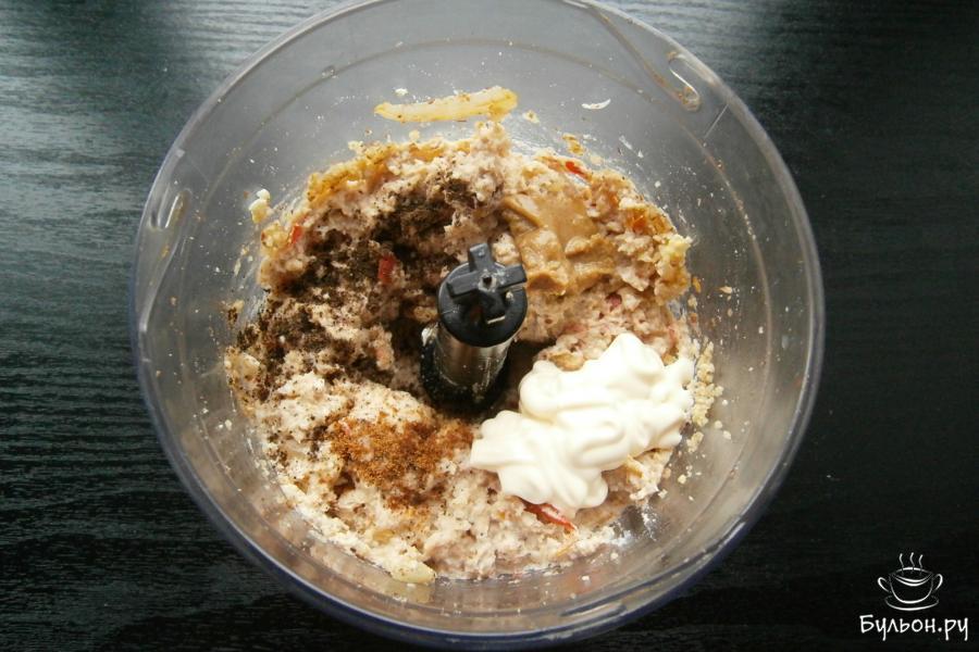 6. Измельчить все на высокой скорости блендера, затем добавить соль, уксус, майонез, перец черный, горчицу, чеснок, мускатный орех и молотый чили.
