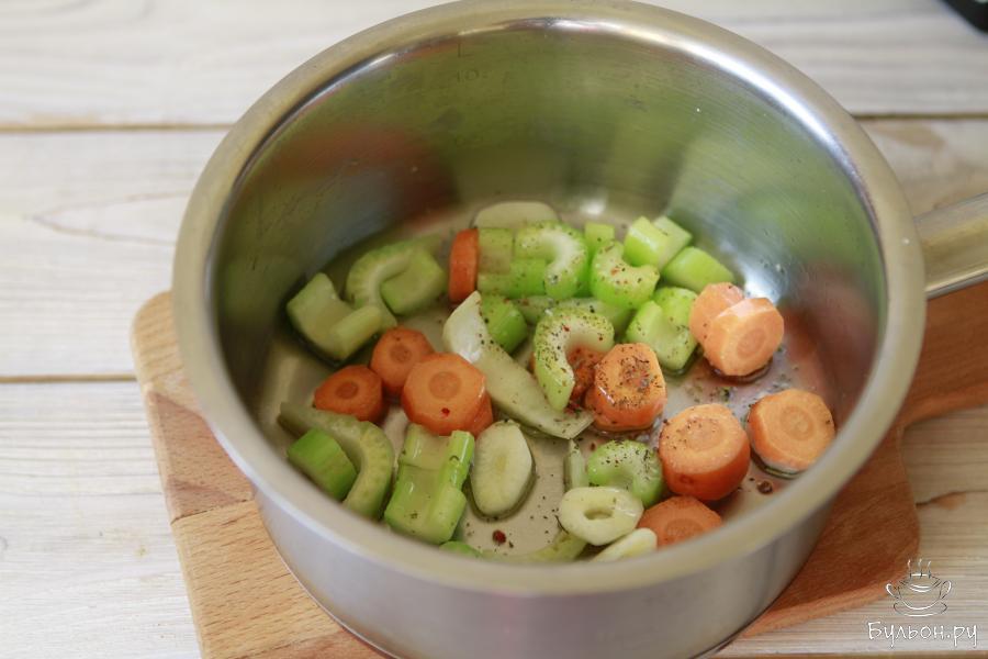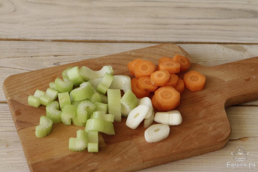 1. Подготовить морковь, стебель сельдерея и зубчик чеснока. Нарезать все овощи на небольшие кусочки.