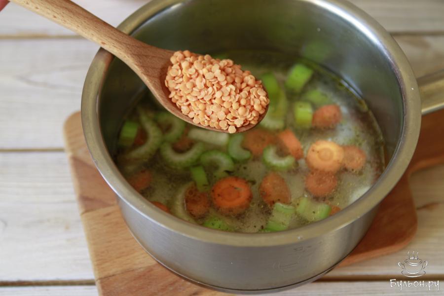 4. К овощам влить теплой воды. Можно влить немного больше, чем указано в рецепте, по готовности легче будет регулировать густоту супа. Выложить чечевицу.