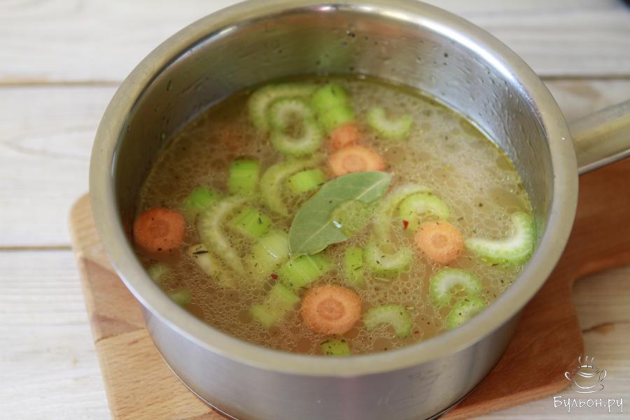 5. Довести до кипения, посолить по вкусу и добавить для аромата один лавровый лист. Варить суп до готовности овощей и чечевицы (примерно 20-25 минут).