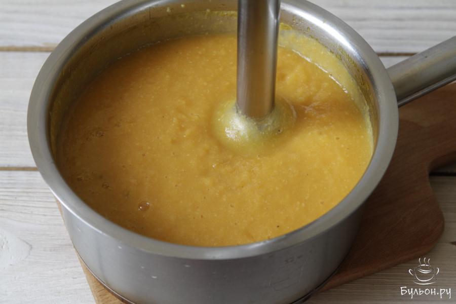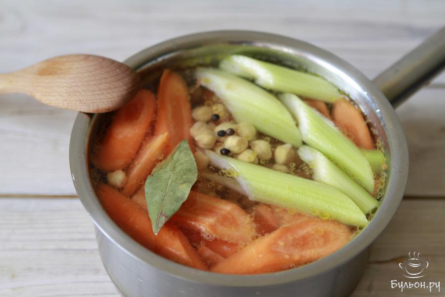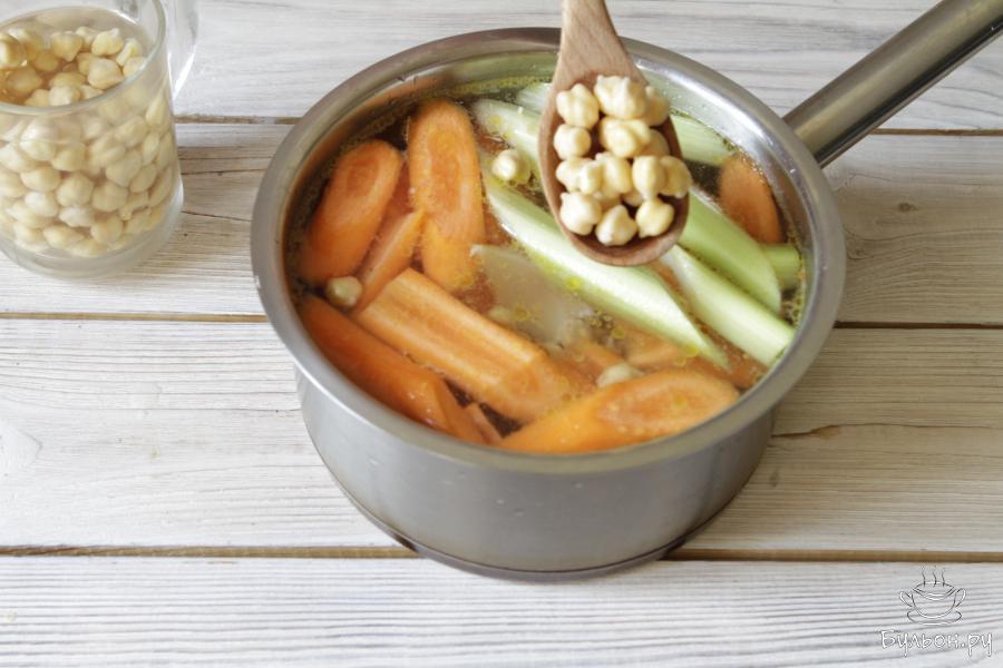 3. К овощам влить питьевую воду и довести бульон до кипения. Уварить его 10-15 минут. Далее к овощам добавить готовый нут, но не весь, немного (3-4 столовые ложки) оставить для декора.