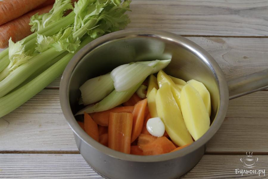 2. Второе, подготовить все овощи по списку, почистить, нарезать и обжарить на оливковом масле 3-4 минуты. Овощи сильно не обжариваем, лишь слегка припускаем, учтите, чеснок может подгореть, его не измельчать. Предпочтение отдать красной моркови, она ароматная и сладкая.