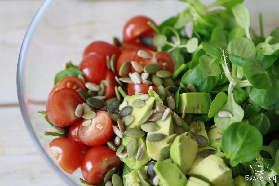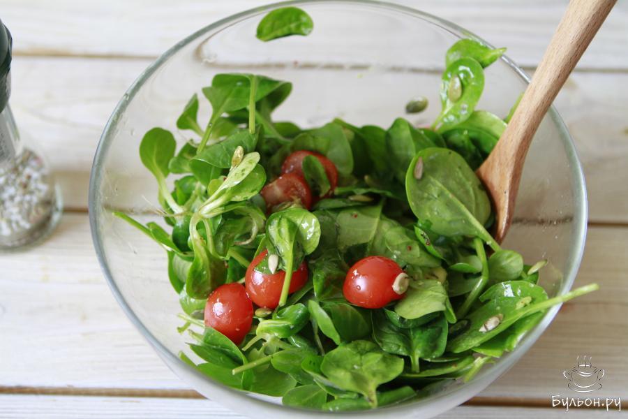 1. Подготовить шпинат и листья салата корн или любого другого салата. Если листочки шпината небольшого размера, как в этом случае, то лучше всего их оставить целиком. Большие же рекомендуется порвать. Шпинат и листья салата корн промыть и обсушить на бумажном полотенце.