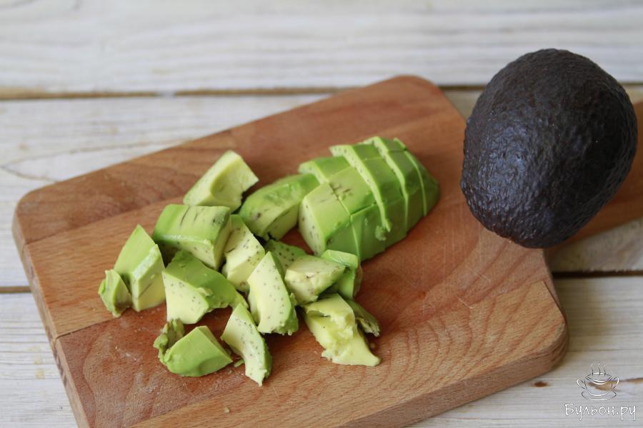 3. Плоды авокадо должны быть спелыми. Авокадо почистить, разрезать пополам, аккуратно отделить косточку от мякоти. И каждую половинку плода нарезать на дольки.