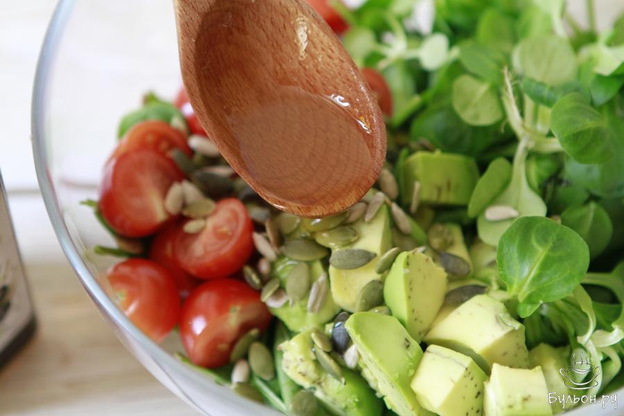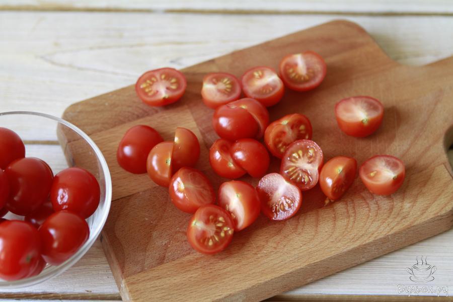 2. Маленькие помидоры черри можно добавить в салат целиком, крупные плоды разрезать на две половинки.