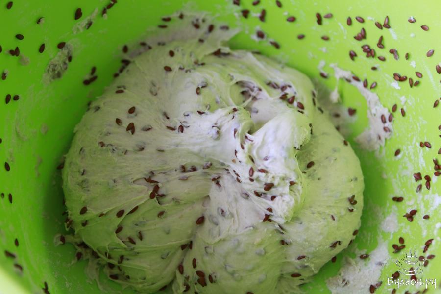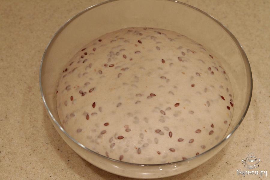 5. Когда опара поднимется, соединить пшеничную муку (высшего сорта) с пшеничной цельнозерновой мукой (182 гр). Ввести всю опару, замоченные семена льна с остатками жидкости и 180 мл воды. Замесить тесто и оставить его на автолиз на 30 минут.