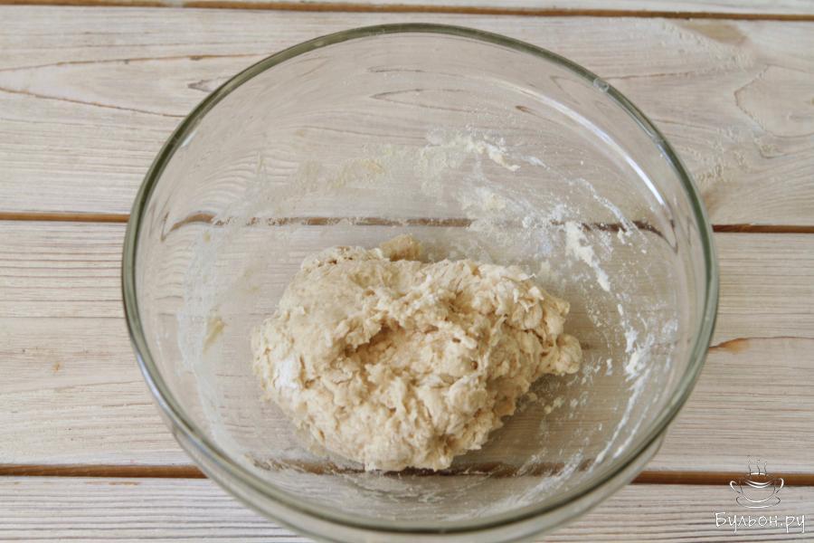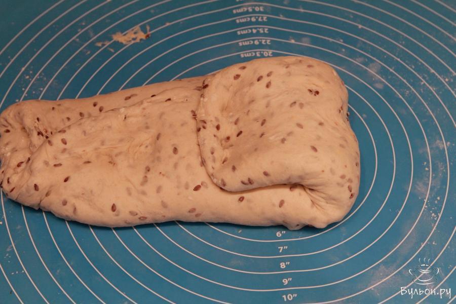 9. Рабочую поверхность слегка присыпать мукой и выложить тесто. Слегка растянуть тесто в диаметре и свернуть.