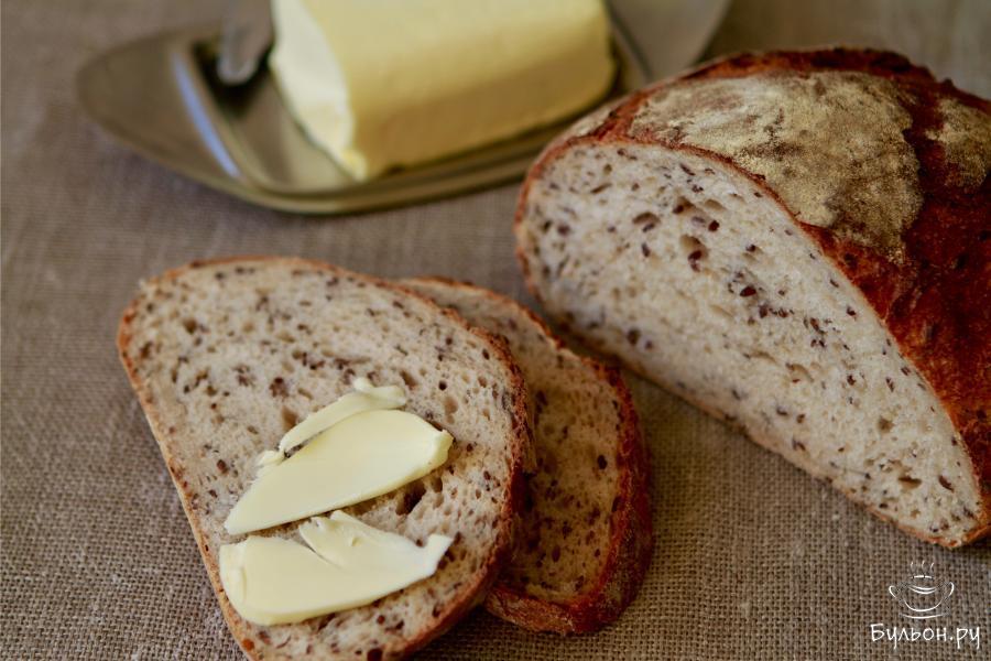 Хлеб приготовленный своими руками всегда кажется вкуснее. Сегодня хочу поделиться с вами рецептом хлеба на закваске с семенами льна. Хлеб получается невероятно вкусным, ароматным, а благодаря семени льна приобретает еще и хорошо узнаваемый и сильный вкус. Опару на тесто можно замесить на пшеничной или ржаной закваске (в данном случае использовалась ржаная закваска 100% влажности). Закваска выращивается отдельно, процесс это не сложный, но правда занимает время от 5 до 7 дней. Время подготовки в рецепте указано с учетом уже готовой закваски. Хлеб выпекается на пекарском камне, который предварительно вместе с духовкой необходимо разогреть в течение часа при 250 градусах. Готовый хлеб перед подачей желательно остудить на решетке. Корочка у хлеба получается хрустящей, а мякиш мягким.