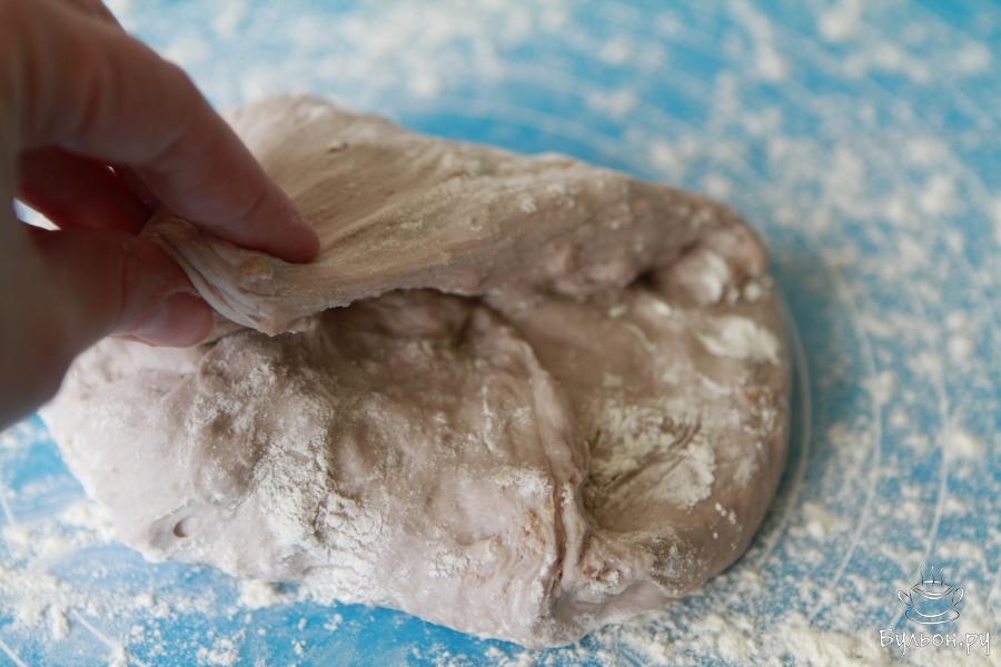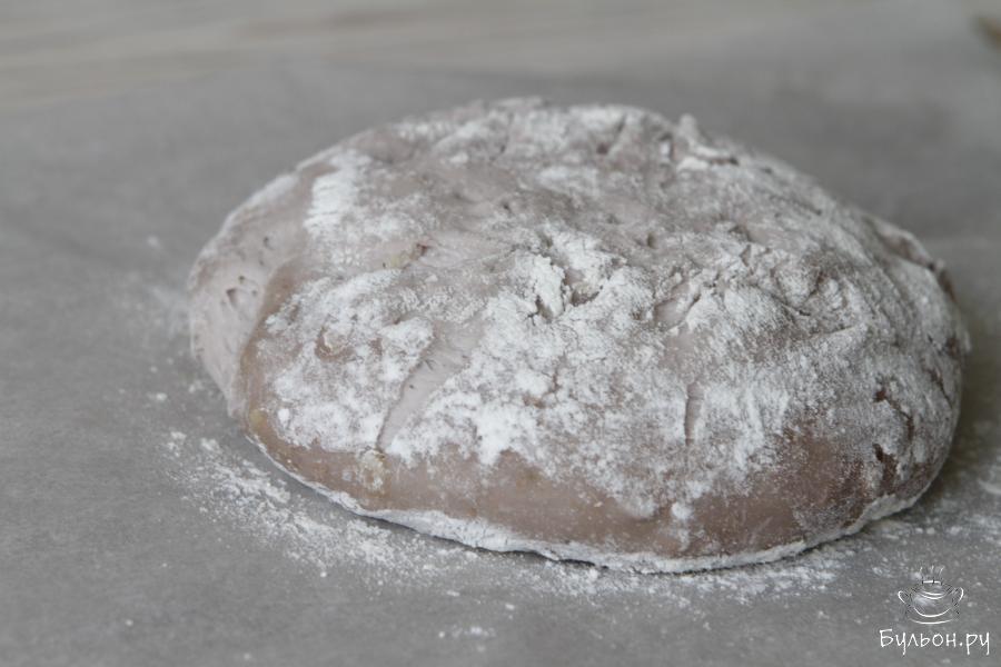 13. Камень для выпечки хлеба разогреть вместе с духовкой в течение часа при 250 градусах. Застелить пергаментом и перенести на него хлебную заготовку.