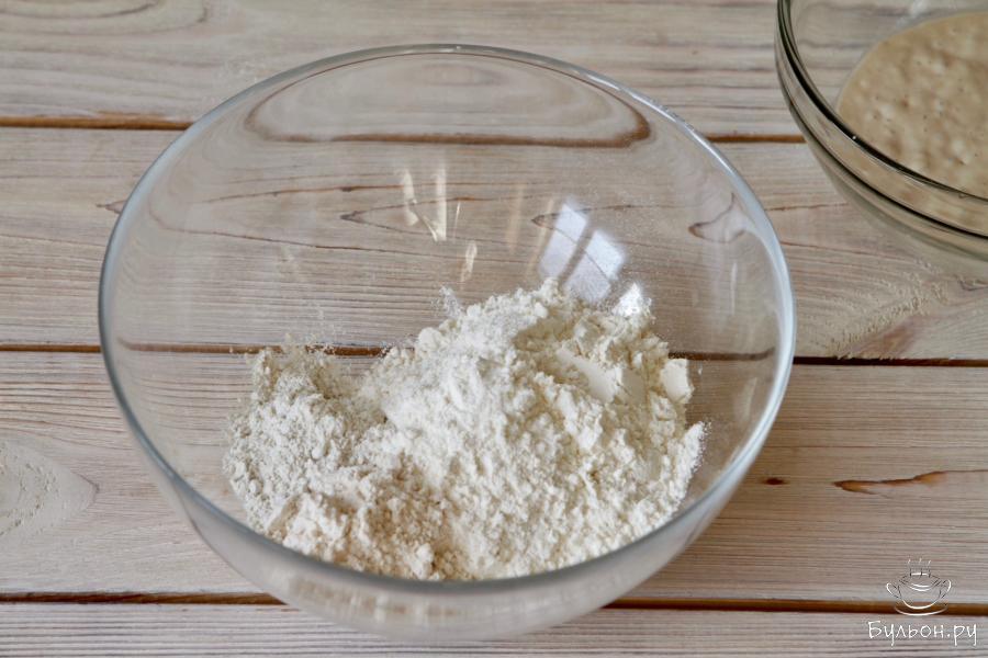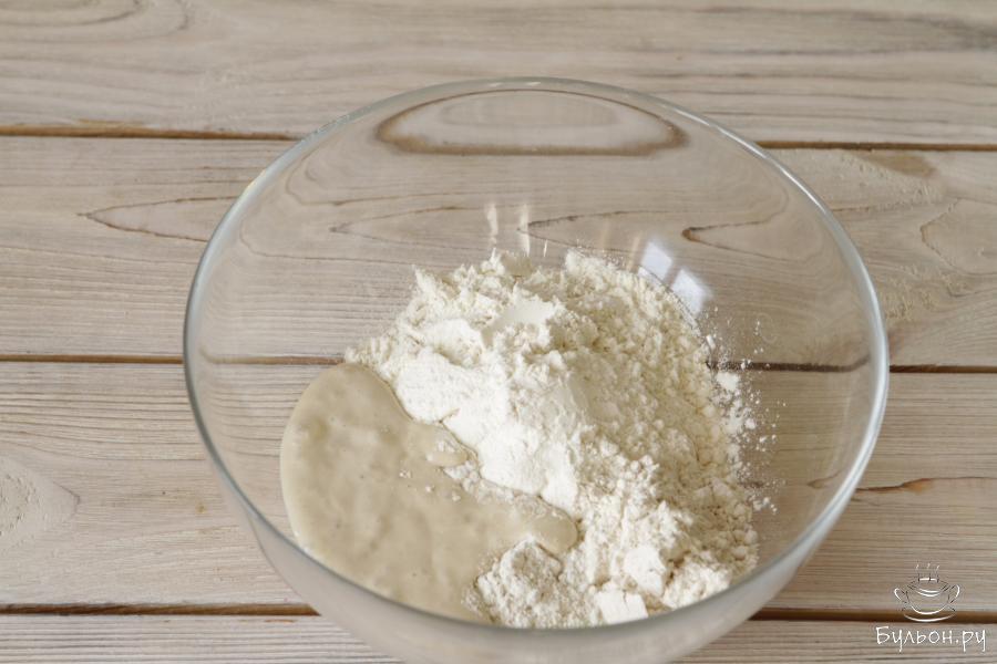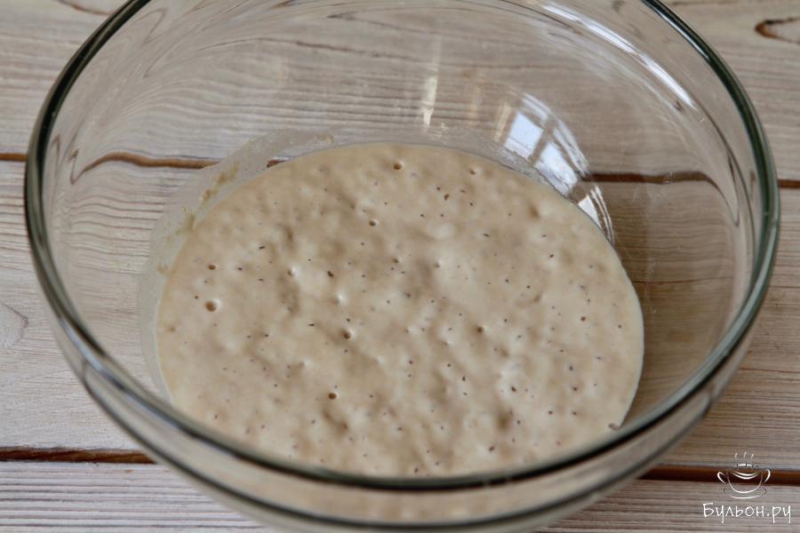 2. С вечера поставить опару. Смешать в чаше 10 гр пшеничной или ржаной закваски с 30 гр муки 1 или 2 сорта и 30 г воды. Чашу закрыть пищевой пленкой и оставить на ночь на 8-10 часов. Готовая опара должна покрыться пузырями.