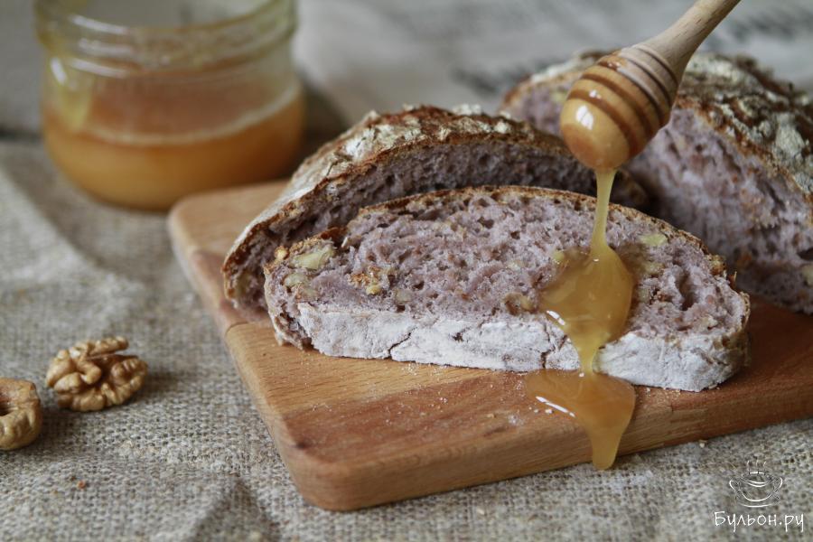 Для всех любителей домашнего хлеба предлагаю невероятно вкусный рецепт хлеба на закваске с грецким орехом. Хлебушек получается очень ароматным, сдоба мягкая, а грецкий орех придает особую пикантность хлебу. Для выпечки хлеба вам потребуется пекарский камень, благодаря которому поддерживается нужная температура для выпечки хлеба в домашних условиях (он создает эффект русской печи). Кроме того закваска у вас должна уже быть готова, вывести ее можно любым удобным для вас способом. Ну и главное строго соблюдать количество ингредиентов указанные в рецепте, а без весов добиться точности у вас не получится. Поэтому весы, так же как и камень для выпечки необходимые аксессуары. Из указанного количества ингредиентов получается небольшая буханочка хлеба весом до 300 гр. В рецепте указано 150 гр пшеничной муки: из них 30 гр пшеничной муки первого или второго сорта для опары, 120 гр пшеничной муки в/с для теста. Кроме того вам потребуется еще немного муки во время формовки хлеба.