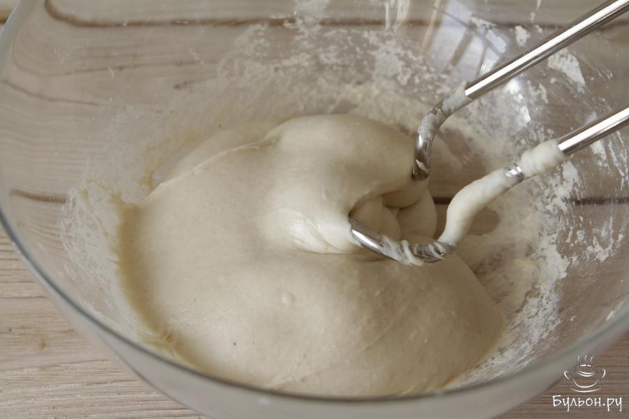 9. Чашу накрыть пищевой пленкой и оставить тесто на подъем на 3 часа. У готового теста будут наблюдаться огромное множество пузырьков.