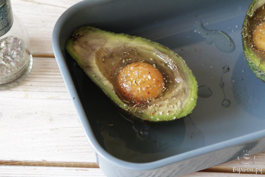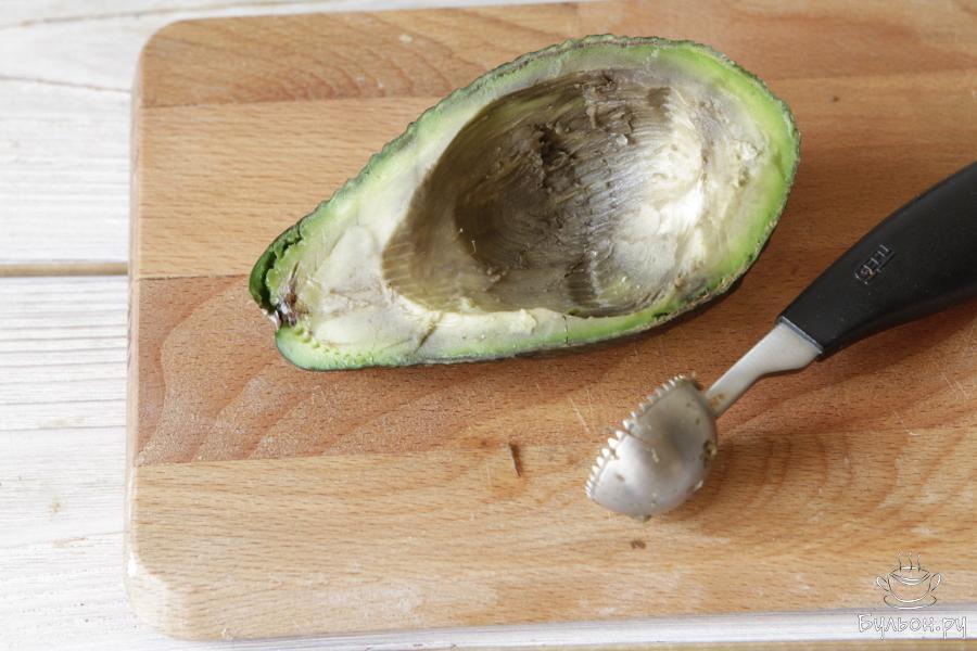 1. Авокадо аккуратно разрезать пополам и извлечь косточку. Авокадо продукт быстро портящийся, самое главное чтобы он не был сильно мягким. Не пугайтесь небольшого потемнения, страшного в этом ничего нет, для салата я бы не стала рекомендовать его, а вот для запекания самый раз.