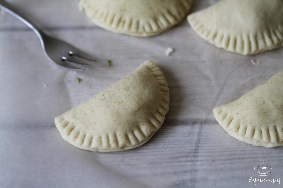 8. Сформировать пирожки (они могут быть разно формы, в данном случае пирожки имеют форму полумесяца). Края закрепить зубчиками вилки.