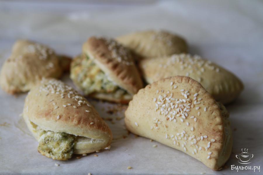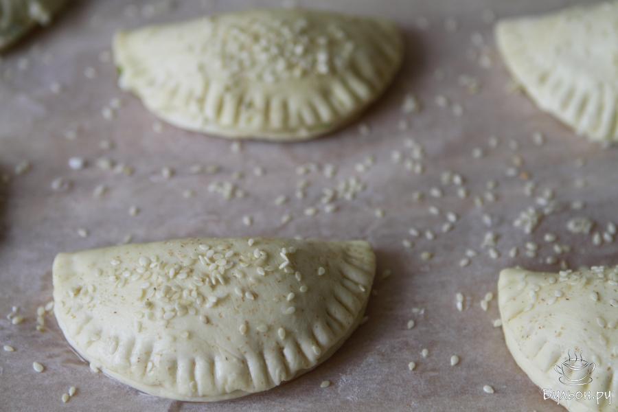 9. Духовку предварительно разогреть. Застелить лист для выпечки пергаментом. Разложить пирожки. Слегка их сбрызнуть водой и присыпать семенами кунжута. Выпекать при 180 градусах 30 минут.