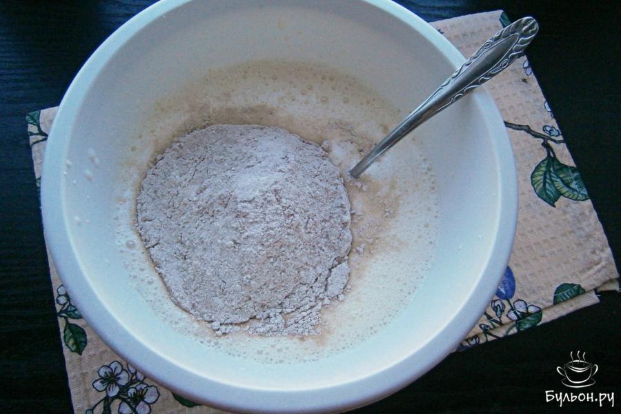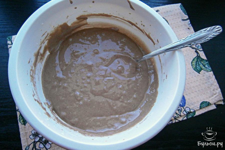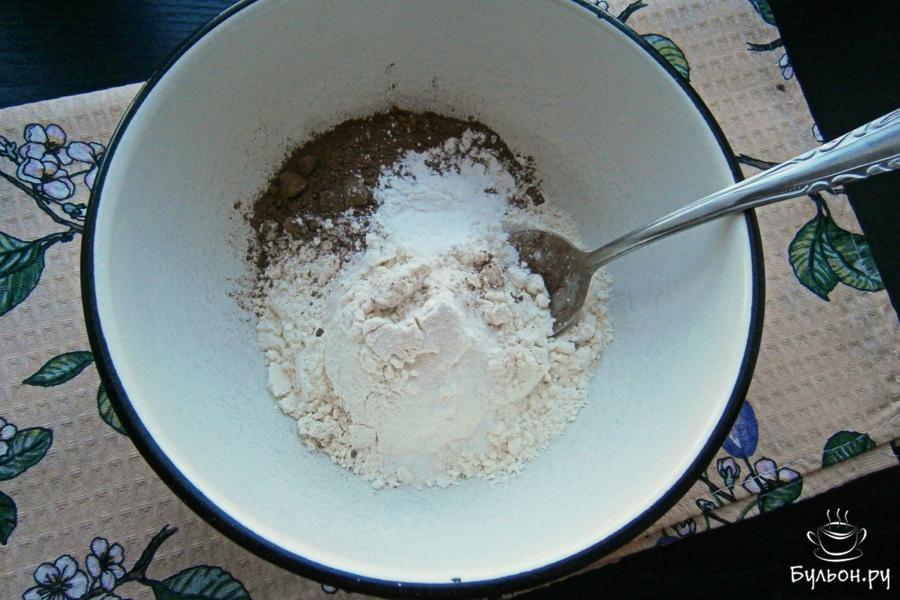 1. Духовку сразу нужно включить на 180 град. Далее, в муку добавить разрыхлитель, щепотку соли и порошок какао.