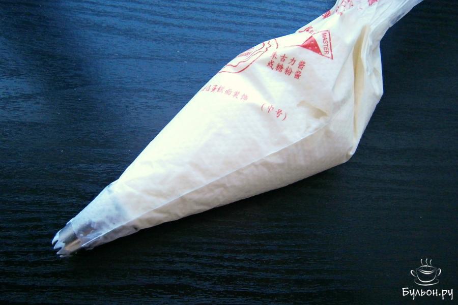 13. Крему дать немного охладиться в холодильнике, минут 5-7, так, чтобы он загустел, но не застыл и поместить его в кондитерский мешок с любой насадкой, у которой большое отверстие.