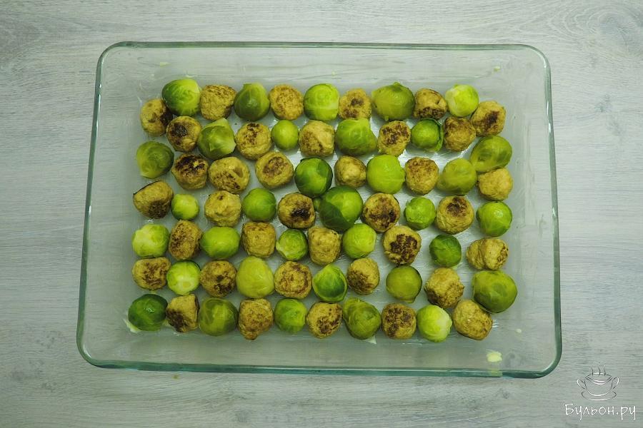 7. Форму для запекания смазать сливочным маслом. Нижним слоем выложить кочанчики брюссельской капусты и мясные фрикадельки.