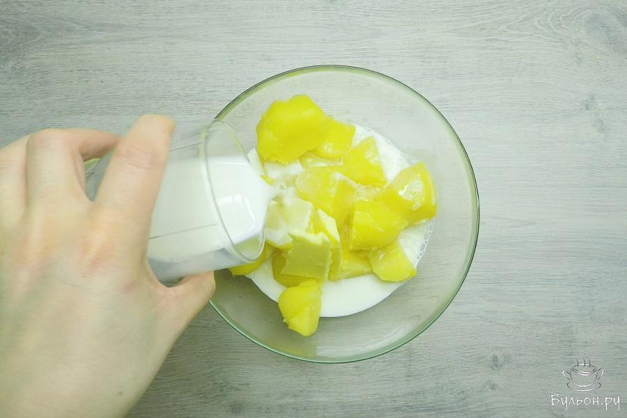 6. Очищенный картофель отварить в подсоленной воде до готовности. Слить отвар. Добавить сливочное масло и горячее молоко. Пюрировать. Добавить яйцо. Перемешать. Пюре должно быть немного жидковатым.