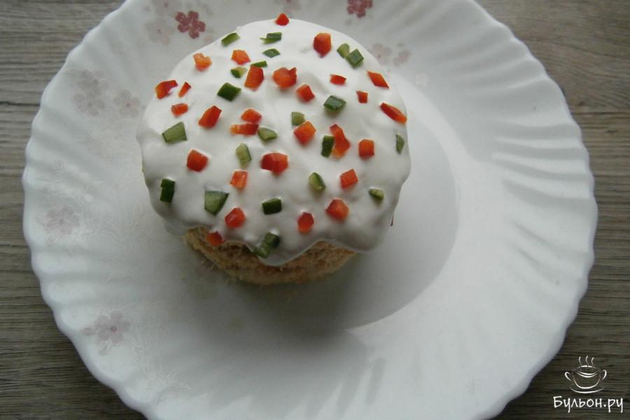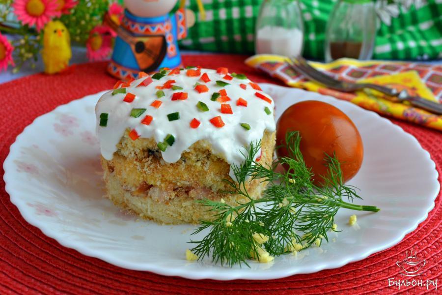 7. Бока приготовленного салата промазать чуть майонезом и аккуратно обсыпать сухарями. Сверху смазать этот салатик сметаной с потеками, имитируя глазурь на куличе. Небольшой кусочек свежего огурца и такой же кусочек перца болгарского порезать очень маленькими кубиками, посыпать ими верх салата.