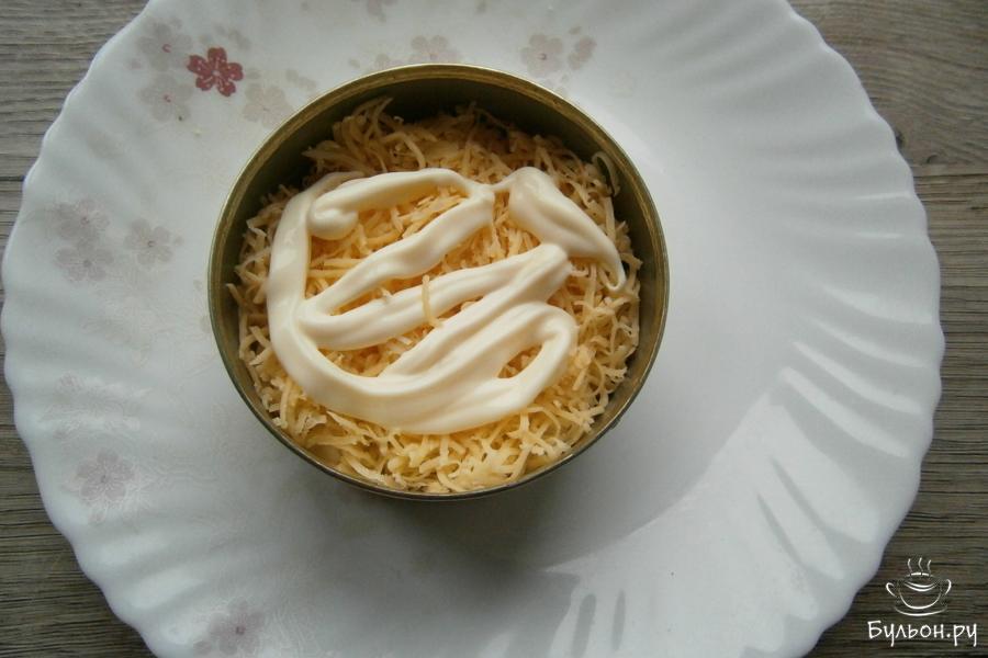 4. Лук отжать и выложить его на ветчину, далее - слой натертого твердого сыра. Для этого используйте терку с небольшими отверстиями. Смазать слой майонезом.