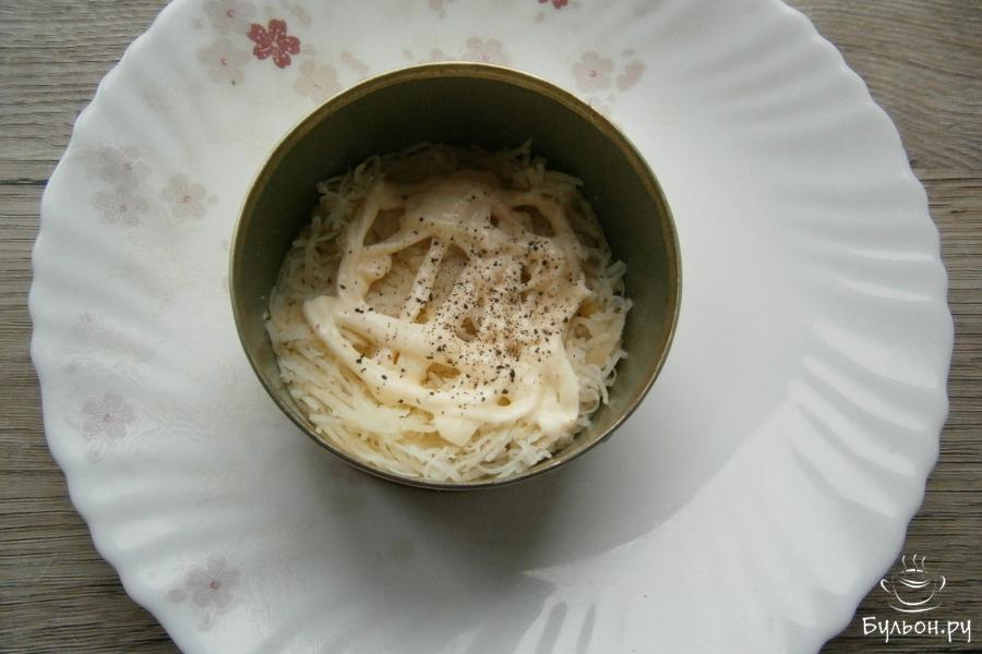 1. Заранее нужно отварить яйца и картофель. Картофелю дать остыть и почистить, натереть его на средней терочке и выложить нижним слоем, формируя салат, используя кулинарное кольцо. Смазать майонезом, поперчить немножко.