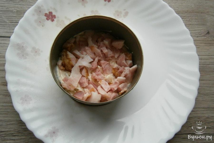 2. Ветчину порезать маленькими кусочками и разместить ее в салате следующим слоем, смазать ветчину майонезом.