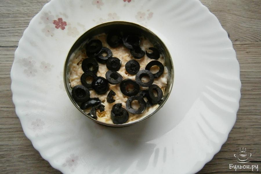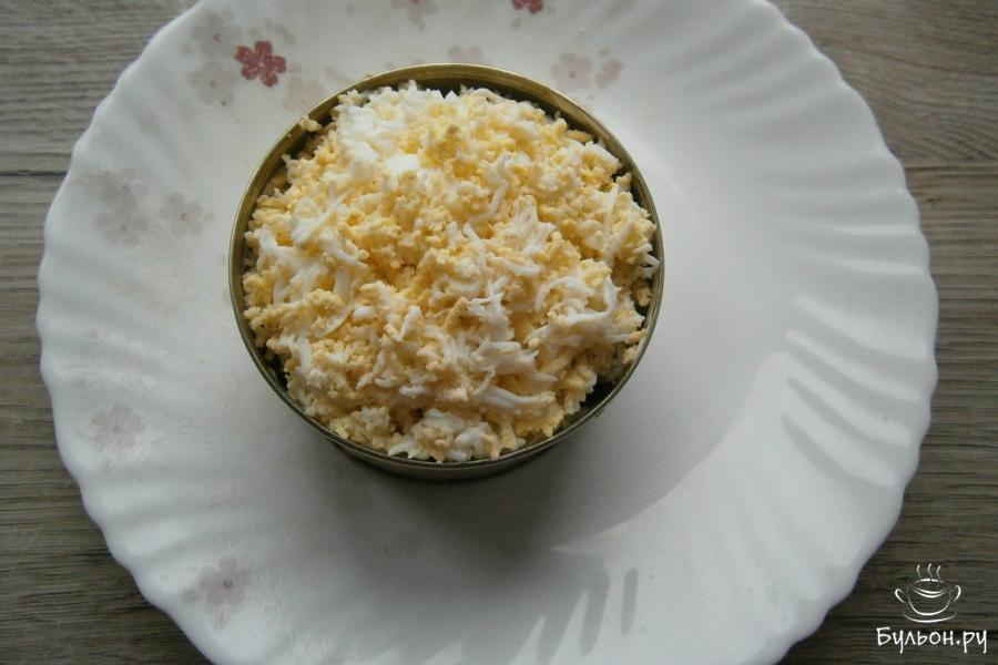 6. Далее, верхним слоем разместить натертые куриные яйца. Смазать аккуратно яйца майонезом, в центре не придавливая салат, чтобы получилась "шапочка". Снять кольцо.