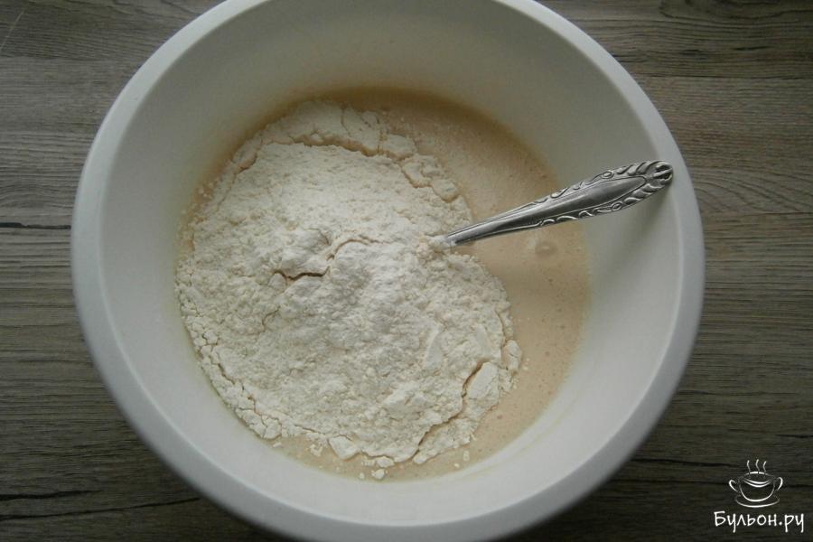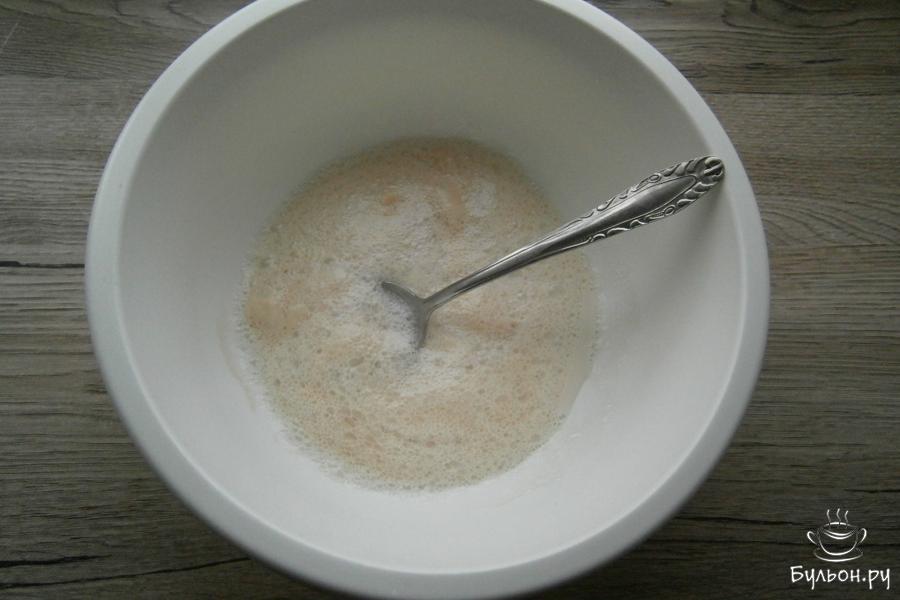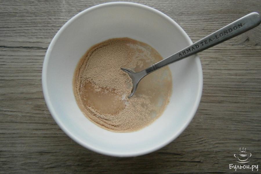 1. В небольшую мисочку влить теплую воду, всыпать сухие дрожжи и чайную ложку сахара от общего количества. Перемешать, накрыть пленкой и оставить на 5-10 мин. в тепле.
