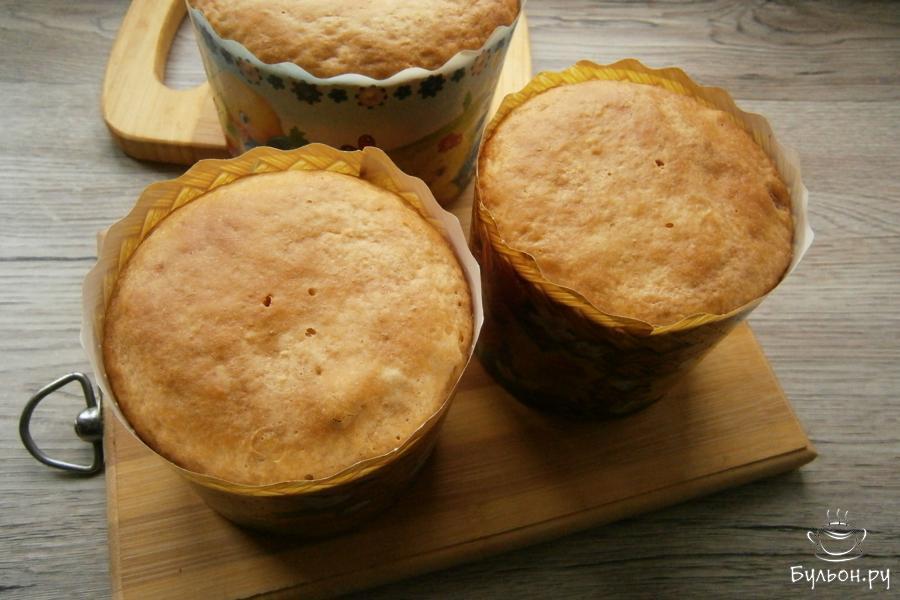 10. Выпекать куличи в горячей духовке при температуре приблизительно 170 град. около одного часа, если выпекаются куличи в средних формочках. Готовность нужно обязательно проверить деревянной палочкой. Готовым куличам дать остыть.