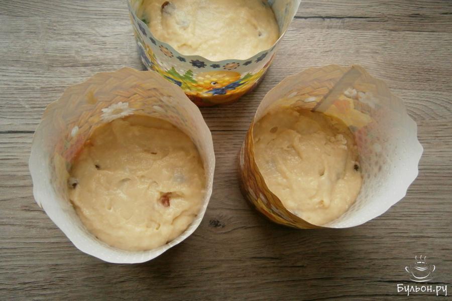 8. Перемешать тесто и разложить его по формочкам, не более, чем на треть. Тесто в дальнейшем хорошо поднимется, а при выпечке увеличится еще.