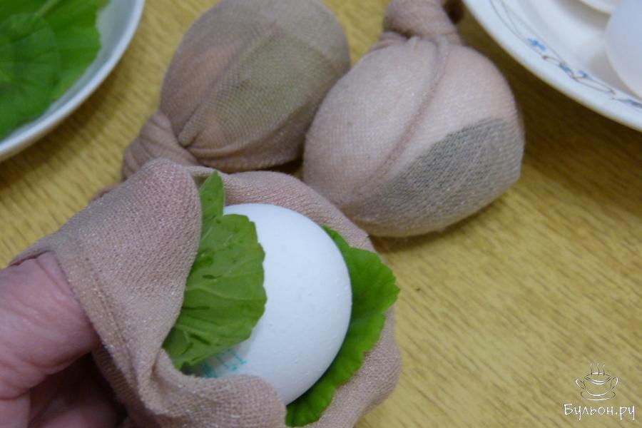 2. Теперь будем "упаковывать" яйца. Для этого нам понадобятся: отрезанная чулочная часть капроновых колготок и листья петрушки и укропа. В зимнее время можно использовать листочки комнатных растений. Взять листик, плотно завернуть в него яйцо, аккуратно положить яйцо в чулок, завязать узел.